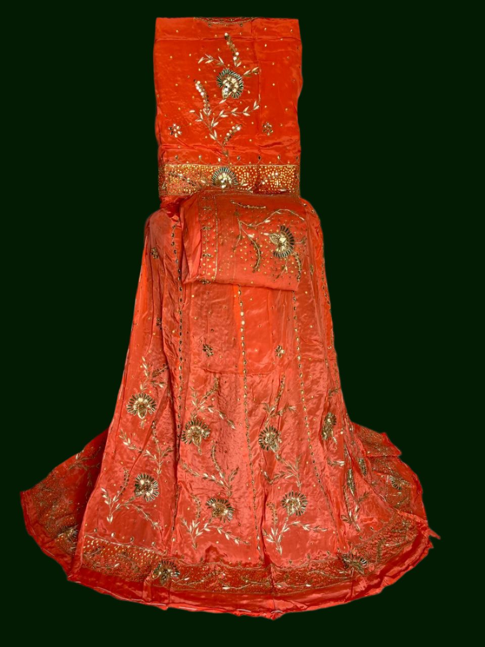 मेहंदी ग्रीन-ऑरेंज राजपूती पोशाक – Tissue फैब्रिक में ज़रदोज़ी और ज़री का बारीक हाथ का काम
